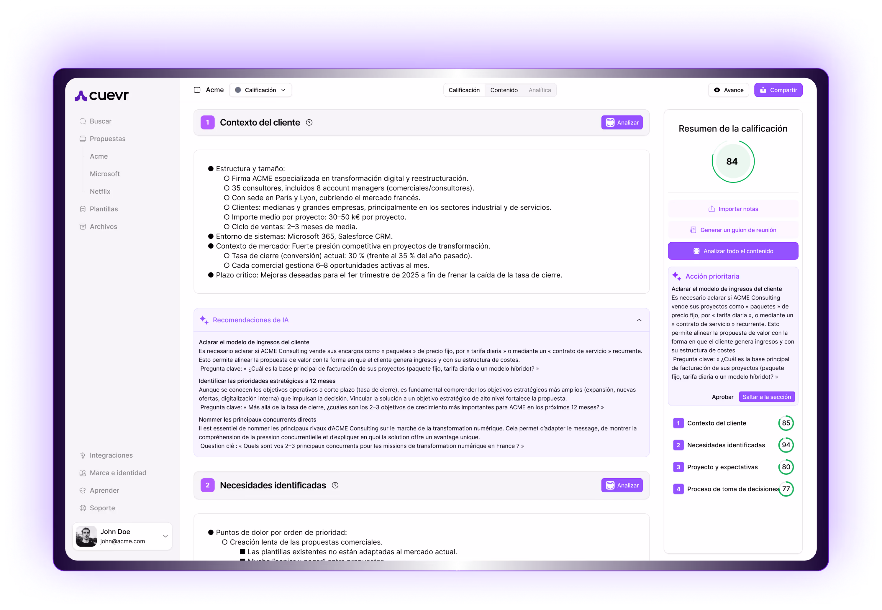 Cuevr analiza cada propuesta y te indica con precisión qué falta para cerrar. El scoring detecta señales débiles y te guía hacia las acciones que realmente cuentan.
