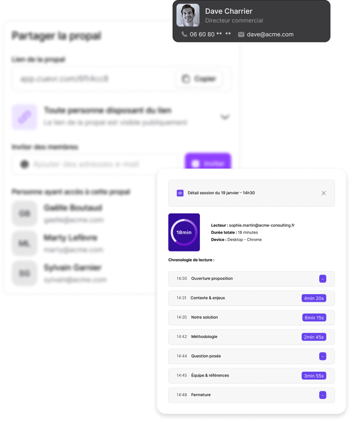 Avec Cuevr, accélérez votre cycle de vente : construisez des propositions commerciales efficaces et relancez au moment clé grâce à une vision claire
