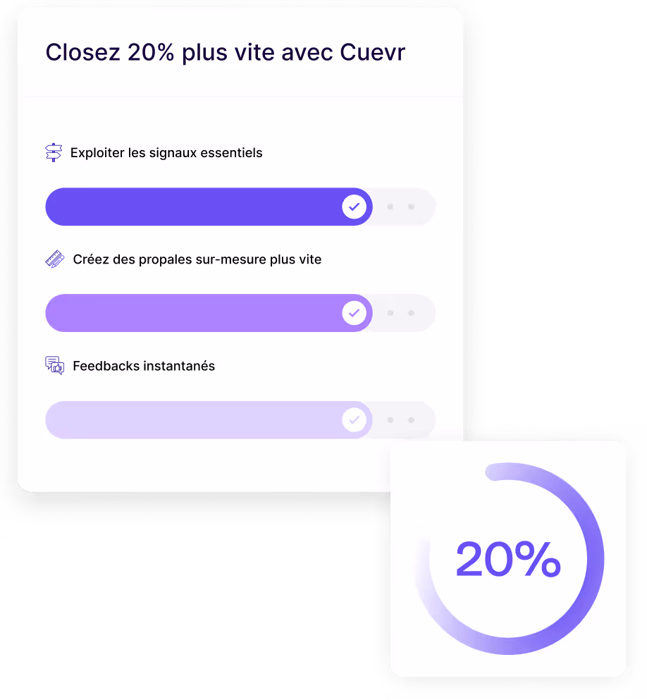 Cuevr intègre le savoir-faire des meilleurs commerciaux, analyse vos propales et vous indique ce qui peut être amélioré pour convaincre et augmenter vos chances de closing.
