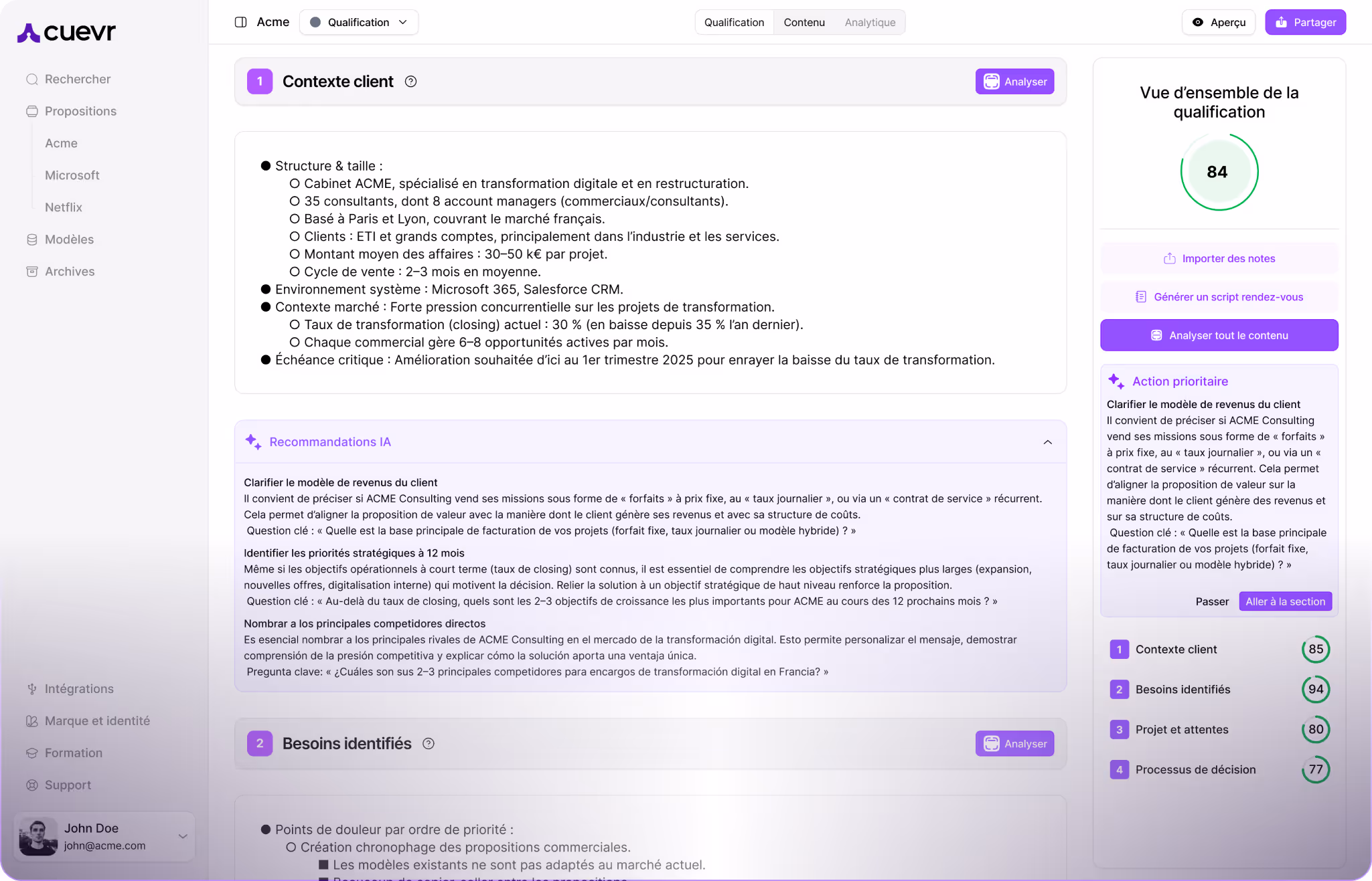 Cuevr analyse chaque propales et vous indique précisément ce qui manque pour conclure. Le scoring détecte les signaux faibles et vous guide vers les actions qui comptent vraiment.