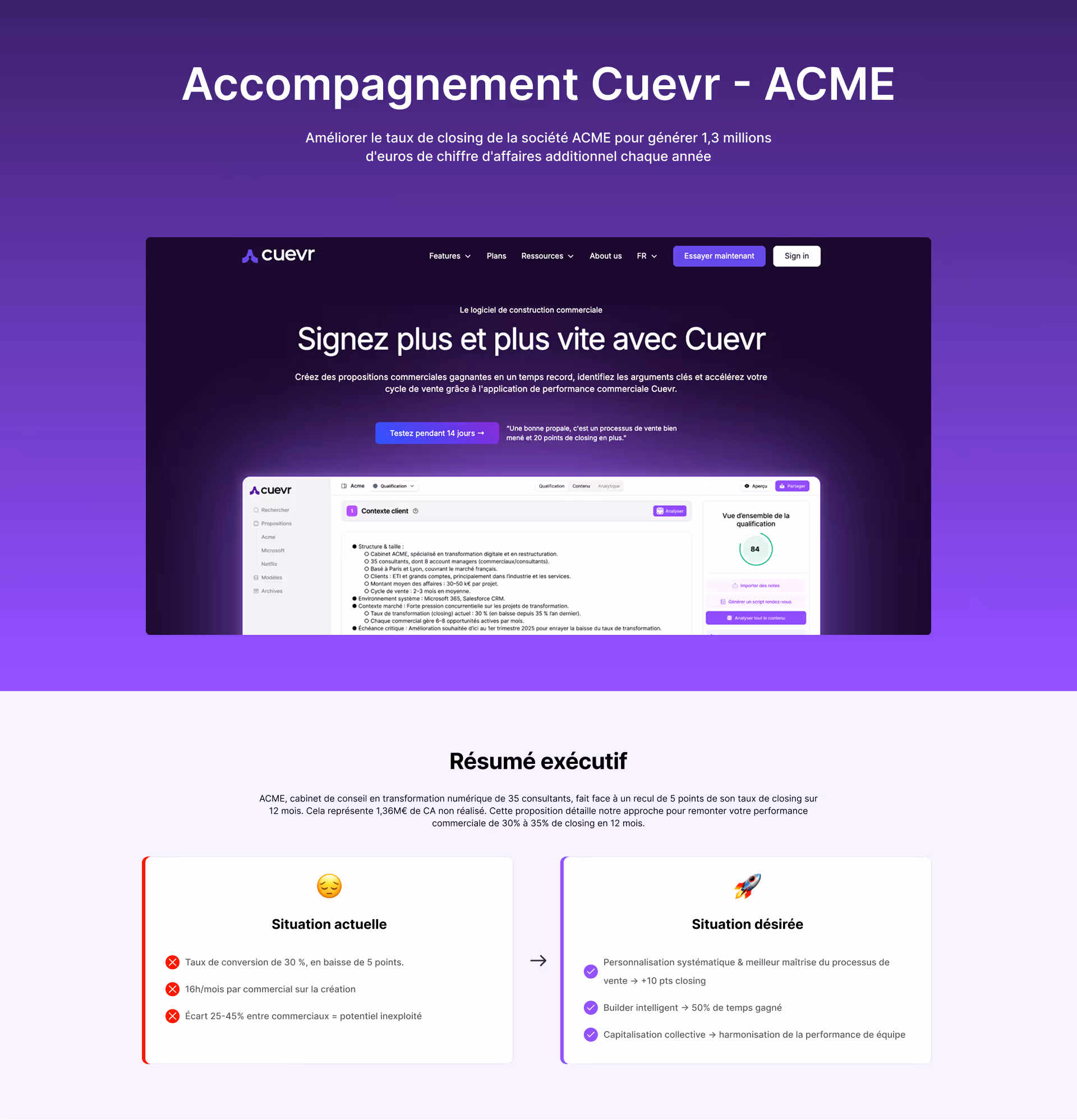 Ne laissez rien au hasard. Cuevr s'assure que vous avez toutes les cartes en main pour conclure : qualification complète, arguments percutants et timing parfait.